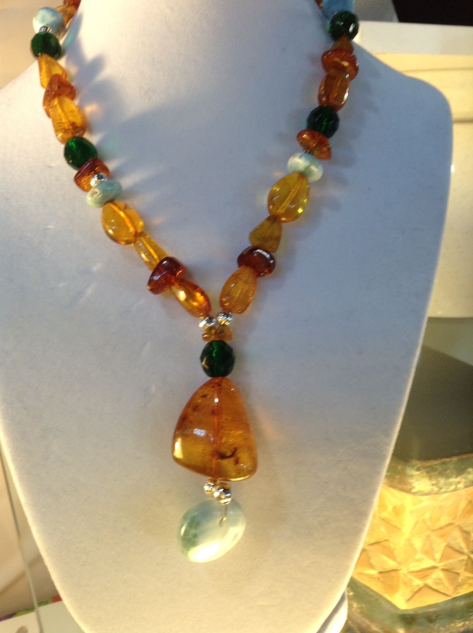 Multi-color hand beaded Dominican Amber with small Larimar crystal